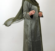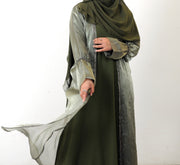 Introducing the Abeer Abaya – a captivating fusion of style and elegance. It features a moss green inner slip with full sleeves, complemented by an open abaya in two-toned green organza. The shimmering shine of the organza catches the eye, while black and silver detailing runs gracefully down the front and sleeves. The ensemble is beautifully finished with lantern sleeves, offering a balance of comfort and sophistication.
