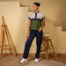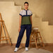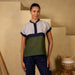 A stylish and versatile top featuring olive green, navy blue, and stone grey color blocks, crafted from breathable linen for a comfortable and chic look.