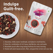Packed with rolled oats, honey, dried goji berries, almonds, cacao solids, sunflower seeds, pumpkin seeds, flaxseeds, our cacao goji granola is an excellent choice for everyone. With a crunchy base, rich dark chocolate and delecious gojiberry flavour, our baked granola is a perfect snack to eat any time.