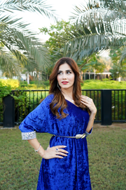 The textured velvet fabric of this kaftan is highlighted by the intricate mirror lace sleeves. Product Type: Velvet Care Instruction: Dry clean only.