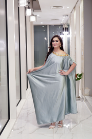This long off shoulder kaftan dress is embellished with beautiful golden lace and white pearls on the neck line made with finest fabric of silk. Product Type: Silk Care Instruction: Dry clean only.