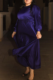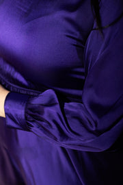 100% Satin balloon sleeves evening gown, with elasticated waist and round neck.