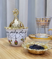 A hand painted Bakhoor holder comes with a coal, single use bakhoor and tong. In addition to it, a mini packet of dates. The Exquisite gift for any occasion to complete the celebration.
