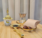 A hand painted Bakhoor holder comes with a coal, single use bakhoor and tong. In addition to it, a mini packet of dates. The Exquisite gift for any occasion to complete the celebration.