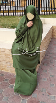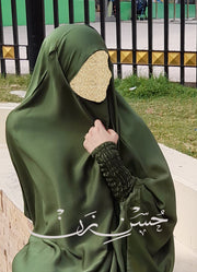 This Mint Green Jilbab in its fun loving color is an ideal gift for the young Hijabis. Our 3 piece Jilbab with elasticated sleeves are perfect for outdoor and indoor wear. It provides full coverage of the body with a free size loose fit so you remain care-free when out and about. Made with premium quality Nada fabric, the Jilbabs are soft and airy and perfect for both summers and winters. Our Jilbab come with a tie-back top Khimar featuring elasticated sleeves, an elasticated skirt that can be easily adjusted according to your height and a standard niqab with tie-backs to cover the face. Khimar Front 44 in
