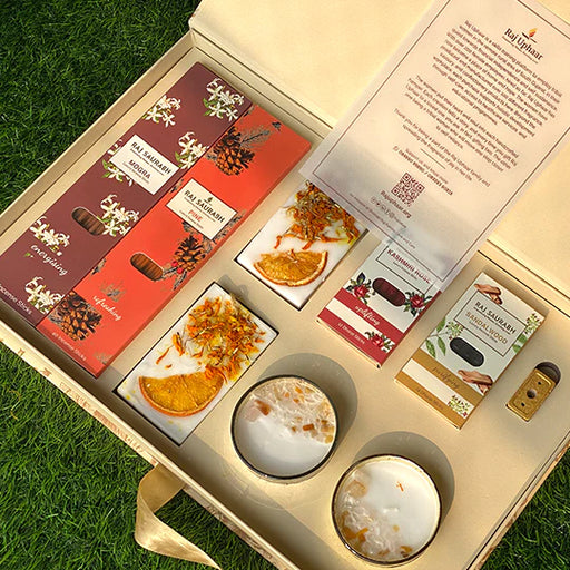 Raj UphaarRadha is a tribute to sanctity and discipline, featuring fragrant dhoop sticks, incense sticks, and delicate mishri jars. Accented with a wooden ur...