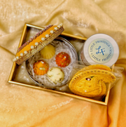 Experience the grandeur of Diwali with our luminous delights. Our exclusive collection of hand-poured candles, carefully chosen designs and eco-friendly edibles will bring a unique sparkle to your celebrations. Illuminate your Diwali in style! This curated selection includes: 5 mithai candles in a Laxmi-designed stainless steel box, Diwali cookies, and spicy mixed nuts.
