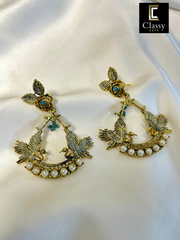 These exquisite earrings seamlessly blend the graceful allure of a bird with the intricate charm of floral patterns. Handcrafted with precision, they feature a mesmerizing combination of stones and pearls.