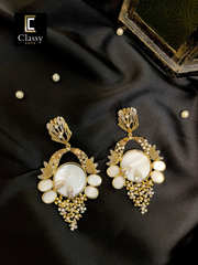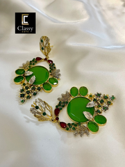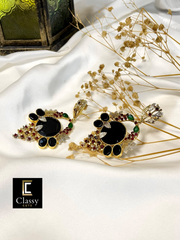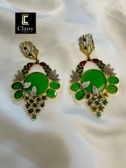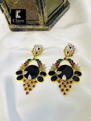 Elevate your style with these hand crafted exquisite earrings – a harmony of elegance and opulence. Encased in a gold frame, a captivating round stone takes centre stage, complemented by delicate stone along the intricate framework.