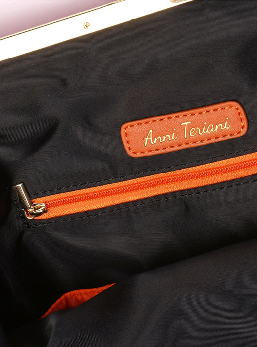 Designer note: These small clutches in amazing grey plain colors will look fabulous for day and evening. The bag can be worn for any occasion. The long black nylon stripe of the bag will allow you to carry it on the shoulder. Stripe with printed white logo ANNI TERIANI. A perfect gift idea. DETAILS: Outer nylon grey color. The lining is nylon black/orange in color. Size (Approx.) - Width 38 cm - Height 21 cm - Depth 12 cm - Frame size 20,5 cm gold colour. Inside zippered pocket. Dry clean only. Pink, Blue, Green, Grey, Orange, Yellow colors are available.