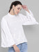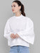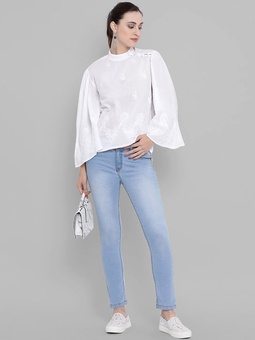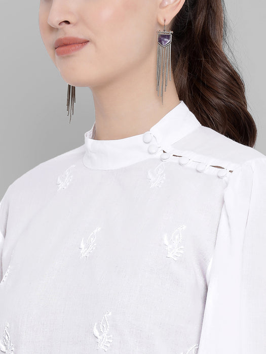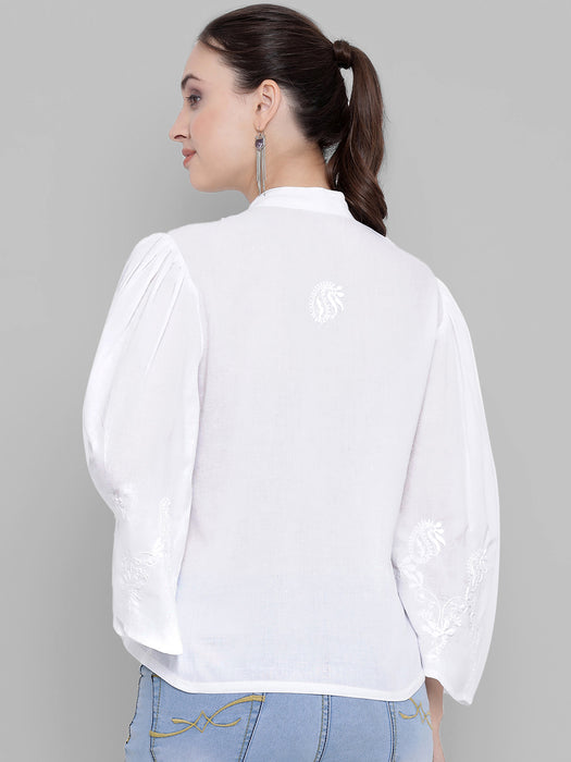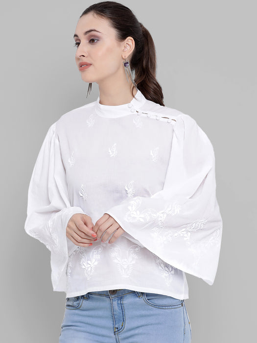 Vibrant voluminous sleeves and the shoulder button detail make this soft white cotton top the one to wear whenever you plan on making a dramatic gesture, decorated with embroidery on hem and sleeves and motifs all over