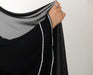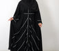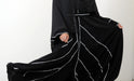 This abaya boasts a touch of opulence with an elegant touch of silver detail running down the front and delicately encircling the sleeves. It's a subtle yet striking detail that elevates the entire ensemble.