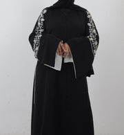 The beauty of this abaya lies in its intricate floral embroidery that gracefully adorns the sleeves,