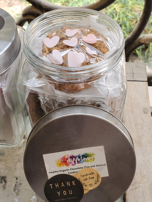 • Healthy Organic Chocolate Chip and Walnut Cookies (486g) – organic raw cane sugar, coconut sugar, eggs, vanilla, organic butter, flour (of your choice), walnuts, oats and dark chocolate chips.