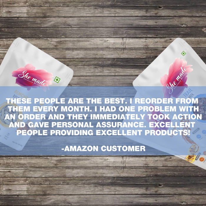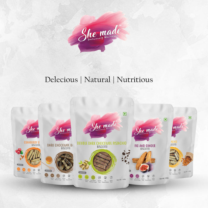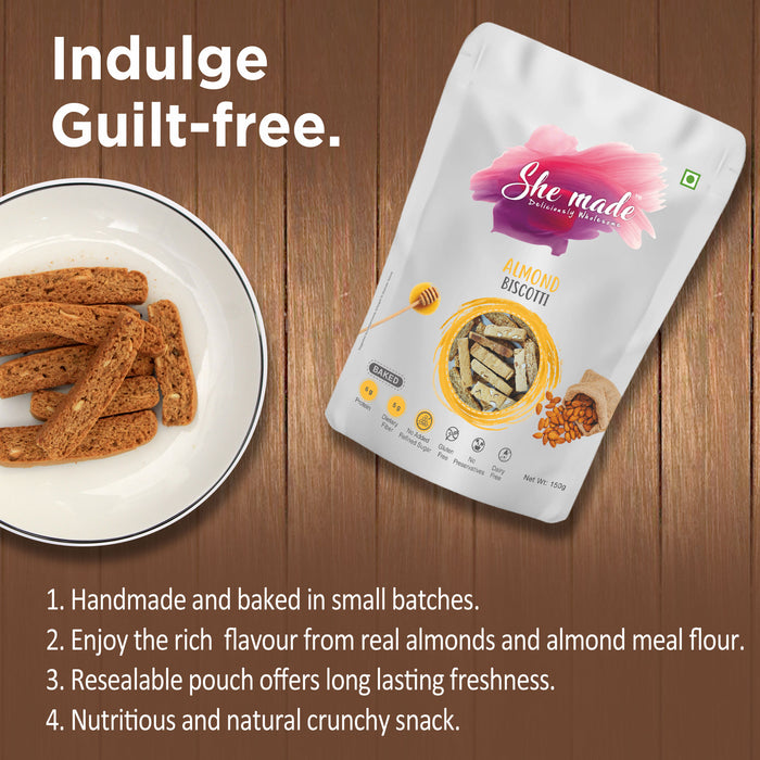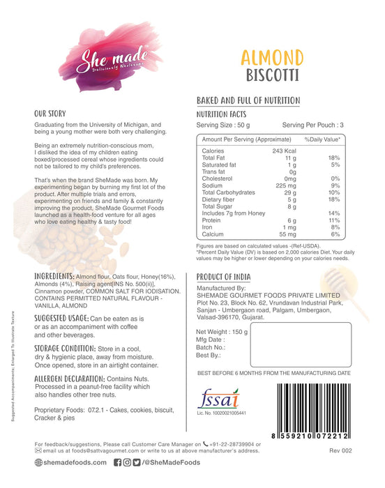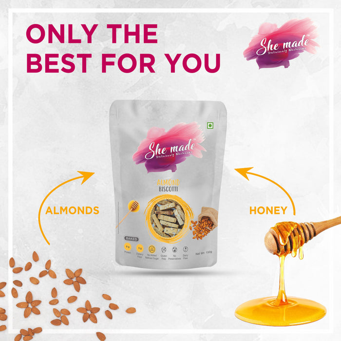 Indulge in your love for dry fruits, honey and cinnamon with our Classic Almond Biscotti. What gives our Biscotti its flavour and crunch? Relish the appetizing flavour of rich classic almond, our baked biscotti cookies are the perfect tea-time indulgence. Made using almond meal flour, almonds, honey, cinnamon and salt, these gourmet biscuits are not just healthy but remarkably flavourful. The addition of nutty almonds, delicious honey, and aromatic cinnamon makes them a wonderfully crunchy and yummy snack with or without any accompaniments. How will the Biscotti benefit me? Unlike refined flour, almond meal flour is known to be a good source of vitamins, proteins, fibre. Packed with important minerals like magnesium and potassium, Almonds are known to lower cholesterol. Our baked biscottis are free of cholesterol, and trans-fat, making it a guilt-free indulgence to fulfil your sweet cravings. They are also plant-based, vegetarian and free from allergens such as gluten, peanut, soy, and wheat. When can I enjoy it and how do I preserve its crunchiness? Whether it’s about enjoying a light and healthy snack or something that can complement your hot cup of coffee and tea, this wholesome biscotti is a perfect choice. Its mild sweetness and crispiness make the biscotti cookies everyone’s favourite. In order to maintain its freshness, these biscottis are packed in a resealable pouch. Once opened, the packaging must be resealed and stored in a cool and dry place until the next indulgence. Why choose She Made Foods? At She Made Foods, we take pride in working towards and sustaining a healthier tomorrow. Made using 100% natural ingredients and flavours, all our products are free from preservatives, refined sugar, artificial flavours and colours. We ensure our nutritious products are clean-label, making them deliciously wholesome for kids and adults alike.