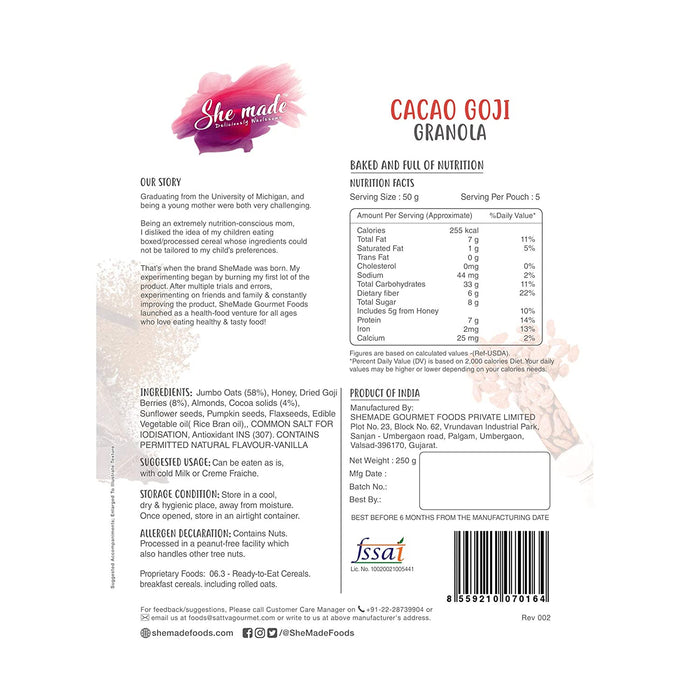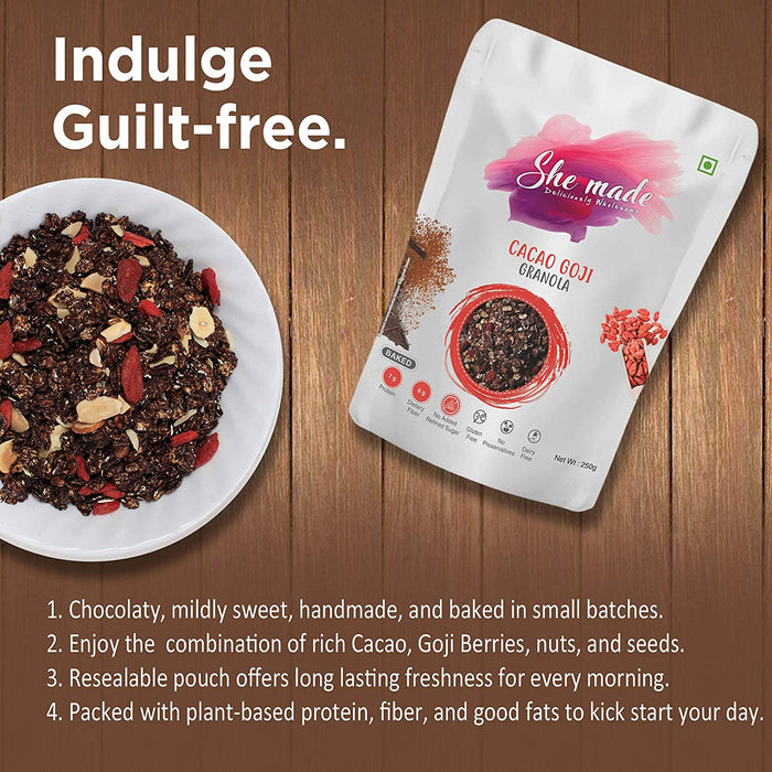 Say hello to your new favorite snack with Cacao Goji Granola from She Made Foods. BEST WAY TO START YOUR DAY Packed with rolled oats, honey, dried goji berries, almonds, cacao solids, sunflower seeds, pumpkin seeds, flaxseeds, our cacao goji granola is an excellent choice for everyone. With a crunchy base, rich dark chocolate and delecious gojiberry flavour, our baked granola is a perfect snack to eat any time. Our breakfast cereal has the protein of a glass of milk and the fiber of one entire apple. Rich is good fats, protein, and fibre, it keeps you energized throughout the day. It contains zero cholesterol and trans-fat to ensure wellness from the inside out. FITS EVERYONE’S LIFESTYLE Made from plant-based ingredients, our granola is 100% natural to ensure the best for your health. It’s vegetarian, gluten-free, dairy-free, and egg-free to suit everyone’s lifestyle. There are no added preservatives, refined sugar, or artificial flavours in our granola. For those with dietary restrictions, our granola is the ideal go-to snack for midday cravings. GET CREATIVE WITH THE RECIPES! Treat your tastebuds with a bowl of granola that can be enjoyed with milk, yogurt, smoothies, or anything else you want. Sprinkle on top of the bowl along with your favorite mix of fruits, seeds, and nuts. Viola! Your gourmet treat is ready. Our granola pack is resealable that can be stored in a cool & dry place to maintain its freshness and crunchiness.